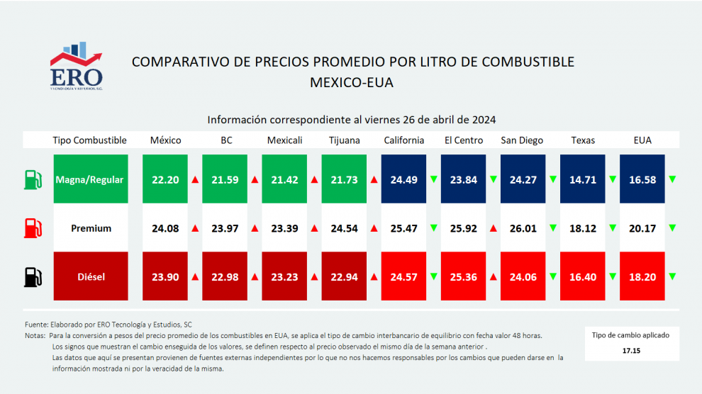 Comparativo de precios promedio por litro de combustibles México-EUA, Viernes 26 de abril de 2024